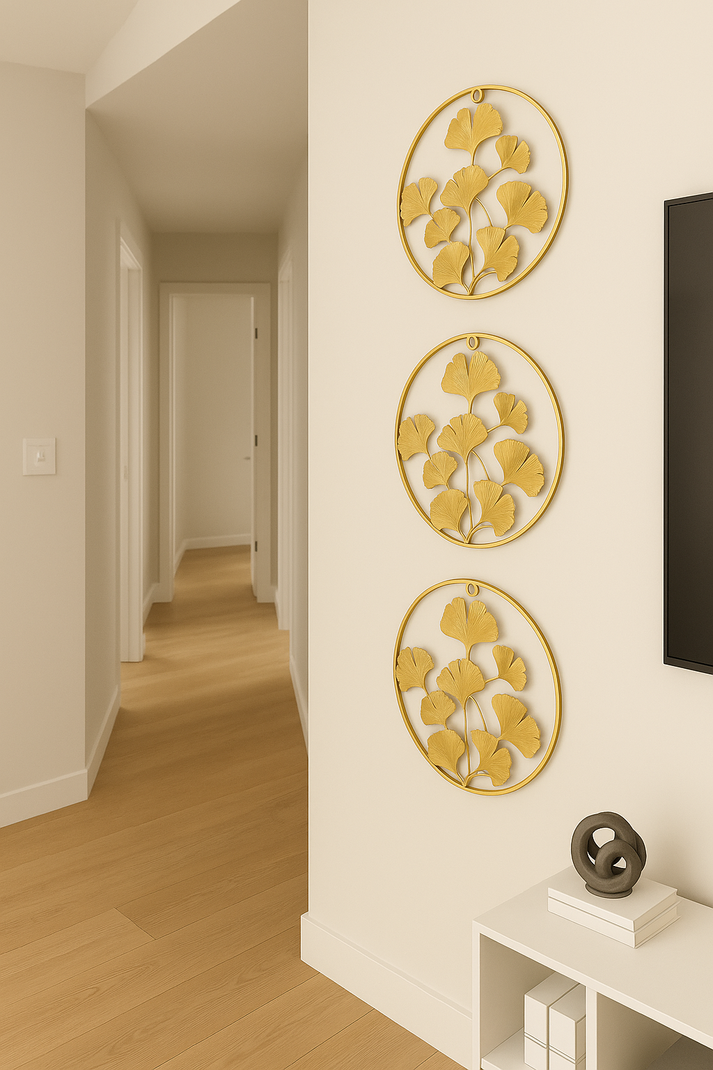 Ginkgo Leaf Design Elevate your decor with this stunning Set of 3 Gold Ginkgo Leaf Wall Hangings. Crafted from high-quality metal, each circular panel showcases delicately detailed ginkgo leaves in an elegant gold finish.