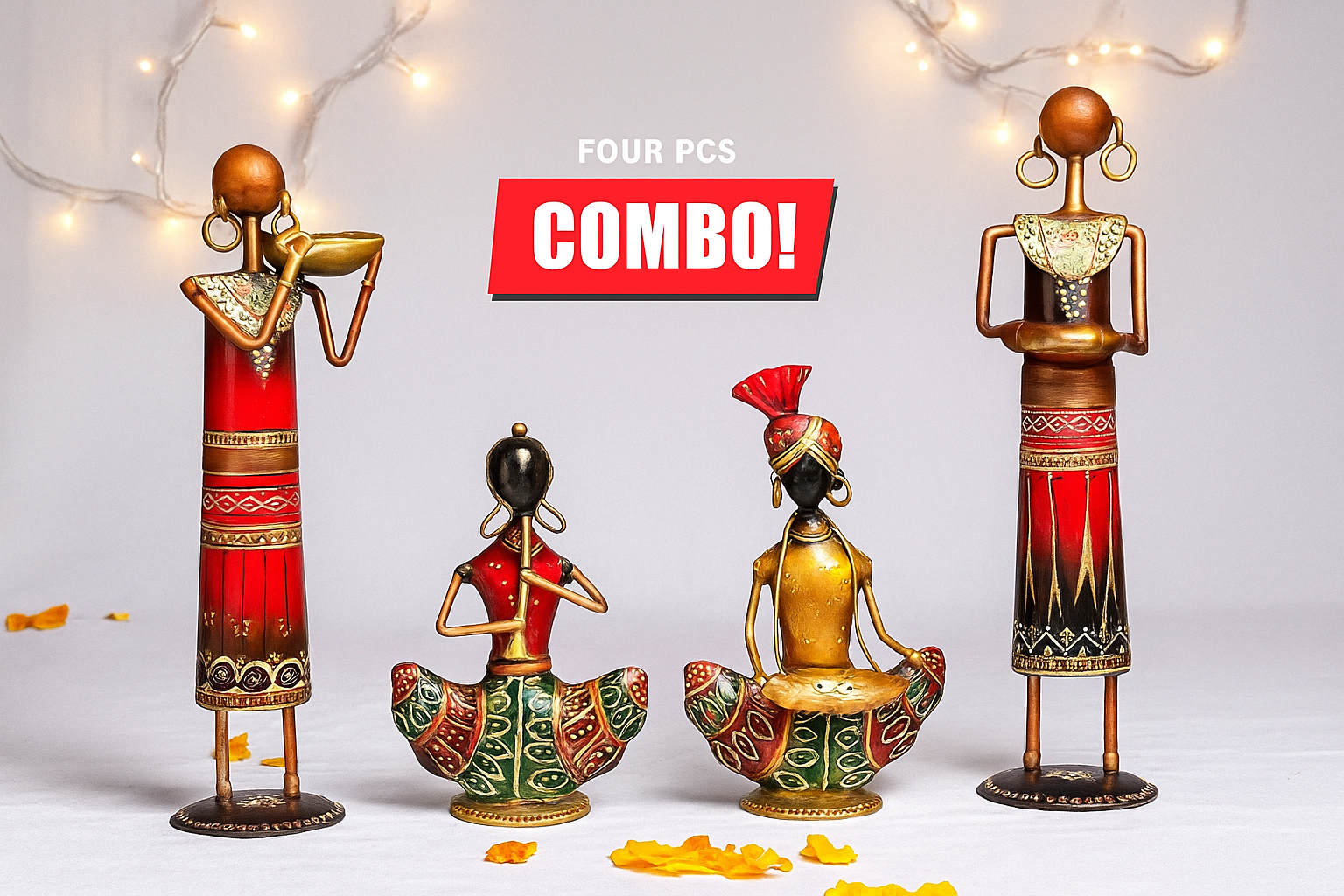 Name: Combo of 4 Handcrafted Rajasthani Iron Musician & Tribal Lady T-Light Holders | Ethnic Table Decor